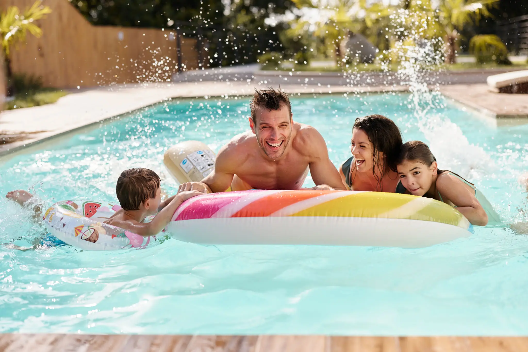 Family enjoying playful time in a backyard pool with a colorful float.